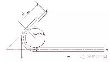 軟件中箍筋計(jì)算時(shí)取的11.9D實(shí)際上是彎鉤加上量度差值的結(jié)果,我們知道彎鉤平直段長(zhǎng)度是10D,那么量度差值應(yīng)該是1.9D,下面我們推導(dǎo)一下1.9D這個(gè)量度差值的來歷: