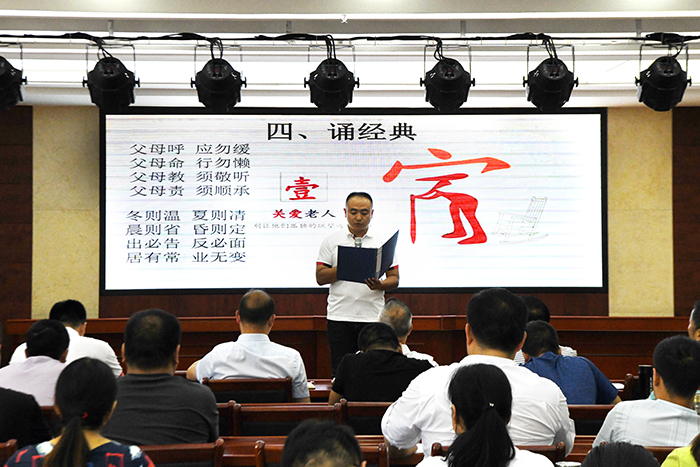 本次活動分為省自身、聽歌曲、學(xué)模范、誦經(jīng)典、談感悟五個環(huán)節(jié)。